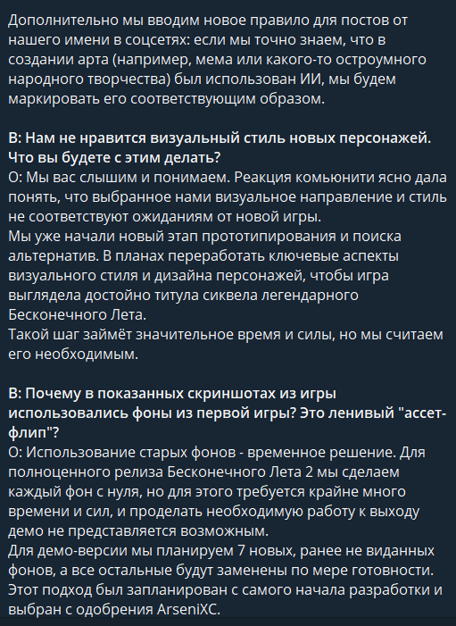 В: Нам не нравится визуальный стиль новых персонажей. Что вы будете с этим делать? О: Мы вас слышим и понимаем. Реакция комьюнити ясно дала понять, что выбранное нами визуальное направление и стиль не соответствуют ожиданиям от новой игры. Мы уже начали новый этап прототипирования и поиска альтернатив. В планах переработать ключевые аспекты визуального стиля и дизайна персонажей, чтобы игра выглядела достойно титула сиквела легендарного Бесконечного Лета. Такой шаг займёт значительное время и силы, но мы считаем его необходимым.