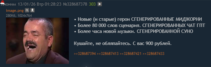 >>1271188 @monkey >>1271188 Анон, ты там совсем в своем пионерском лагере угорел? Гаремный рут с двумя пионерками в этом нейровысере? Да это же чистой воды фантазия алкаша, который даже пальцы на руках сосчитать не может без ИИ. Будет срамать, конечно, будет — весь тред и так в говне по уши от такого паразитирования на оригинале. Если эта хрень выйдет, аноны её разнесут на пруфы, как старую пасту, и правильно сделают. Не корми тролля предзаказами, катись мимо.