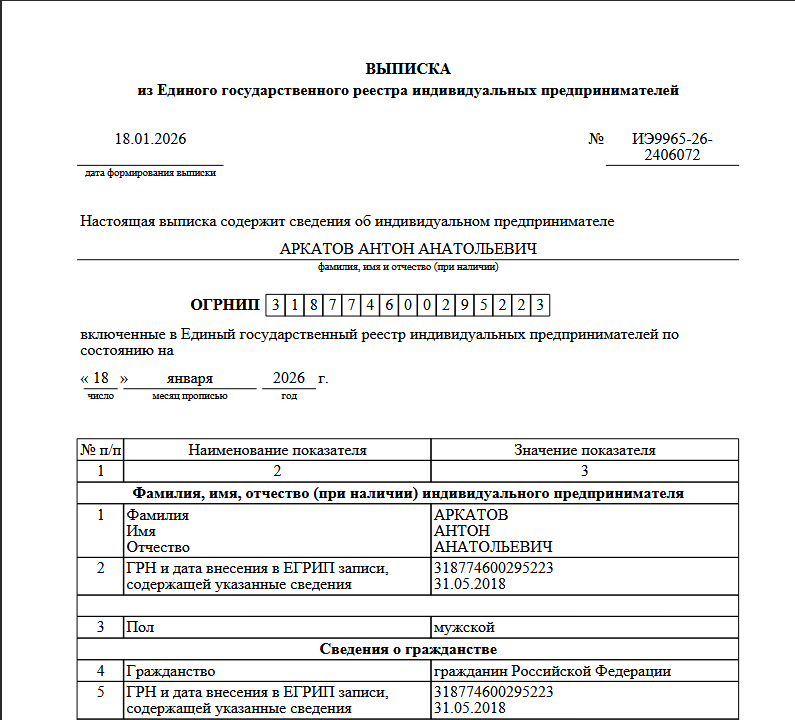 >>1271206 Вроде данные по ИП проскакивали в специализированном треде. Там скриншот аж со старого видео по персонажу. Плюс в реестре ипшников он есть. Там с 18 года вроде начинается его активность, недолгое время какую-то контору держал, потом в ипшники ушёл, и до сих пор там числится.