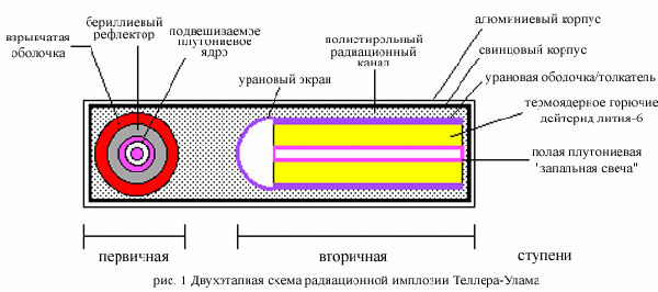 Не пойму хули вы тут сретесь. 1. Есть атомные бомбы(боеголовки)(хиросима/нагасаки) там плутоний делили. Короче в центре то что создает выброс нейтронов при определенных условиях(детонация) это берилий/полоний, с детонатором. вокруг то что делится от нейтронов из центра, это уран235 или плутоний239. Делимое вещество формированно в кусочки с массой до критической, чтоб не началось самопроизвольное деление. Вокруг еще детонаторы которые при активации отбрасывают кусочки в центр и получается один кусок с критической или более массой, в центре него нейтроны вылетают. Если все сработало четенько и нейтронов хватит для мгновенной реакции то будет бабах мощный, но если нейтронов будет не хватать то взрыв будет слабее т.к. непрореагировавшее делимое в-во просто разлетится в стороны и будет гореть и понемногу радиоктивить, т.к. уран235 или плутоний239 не могут выделять так много нейтронов сами чтоб прям их ебашило, они просто будут грется и раскалятся докрасна. На 1 из 3 пикчах. 2. Есть термоядерные бомбы(боеголовки) там синтез легких ядер смеси изотопов лития и водорода на 2 из 3 пикчах. Взрыв водородной бомбы (более 20 Мт) генерирует невероятное количество тепловой энергии, достаточной, чтобы расплавить бетон на расстоянии в 5 км, выпарить воду практически всю воду из небольшого озера на расстоянии в 10 км, уничтожить живую силу противника, технику и постройки на том же расстоянии.В центре образуется воронка диаметром 1-2 км и глубиной до 50 м, покрытая толстым слоем стекловидной массы (несколько метров пород, имеющих большое содержание песка, почти мгновенно плавятся, превращаясь в стекло