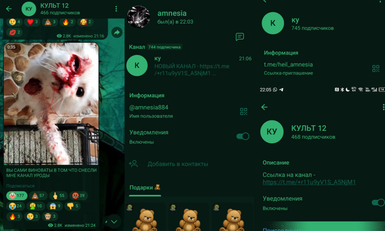 Здравия желаю. двачеры. Нашел одну мразь которая издевается над животными, ее юз в телеграме:@amnesia884. видео настоящие как и животные, также в ее ТГК есть кружок где избивает бабушку, если смогу сойденю ключевое, скорее всего это байт, но если нет, то помогите наказать это тварь. Это мой первый и последний (надеюсь) тред тут, скорее всего больше не буду писать. До встречи, двачеры