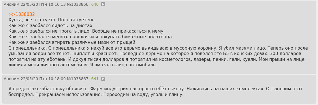 Чем витамин А из пищи, ну или бадов на крайний, хуже мазательного ретинола? Если ретинол на кожу помогает - мб у человека просто хронический дефицит вит. А был? Почему питанию кожи/волос изнутри так мало внимания уделяется? Я думаю потому, что на этом никому не заработать, а за бесплатно "банальную" базу выдавать мало кому охота. И людям впадлу питанием заниматься, лучше чипсиков с колой пожрать, и "скомпенсирвоать" 5 средствами