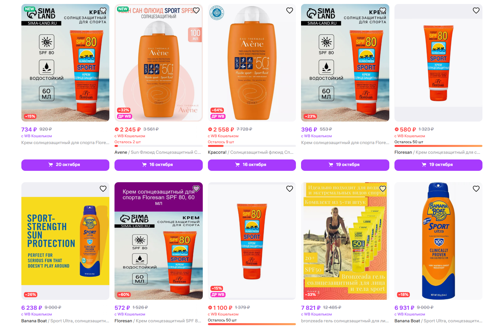 А ещё много странных кремов для спорта на маркетплейсах, у которых разброс цены от 600 до 6000 рублей.