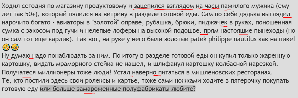 ТС купил часы и сам остался ими очень доволен. И подошли хорошо и вообще красивы как не глянь, поделился радостью с форумчанами, которые кинулись на перегонки поздравлять с покупкой хвалить и завидовать, а некоторые уже готовы были тут же их выкупить себе - все счастливы. Но только до тех пор пока не обнаружилось, что цифра "2" не так загнута как должна бы. И всё сразу изменилось - белое стало черным, достоинства недостатками, часы перестали радовать, хотя остались точно теми же самыми, что и были с самого начала и идут также точно как и шли и сидят на руке так же как и раньше, но до этого уже нет никому никакого дела. Да и кому тут вообще интересны сами часы?
