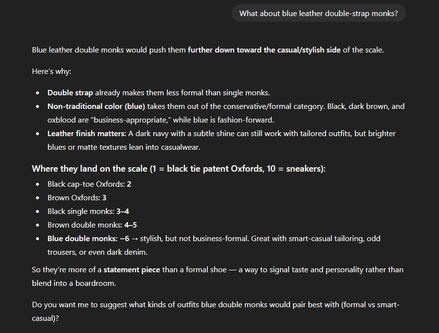 >>1917234 Ты споришь не с тем тезисом. Господь избавил меня от необходимостти носить синий костюм, и строгий синий костюм носят с черной обувью, таки да. Но 1. Черная обувь не является универсальной, напротив, коричневая сочетается проще 2. выше запрос на иной случай, там кардиган, то есть гораздо менее формальный лук, в котором коричневые замшевые челси/броги/лоферы будут уместнее Опять же. синии брюки придется заменить. потому что синий кардиган и синие брюки это почти наверняка пиздец
