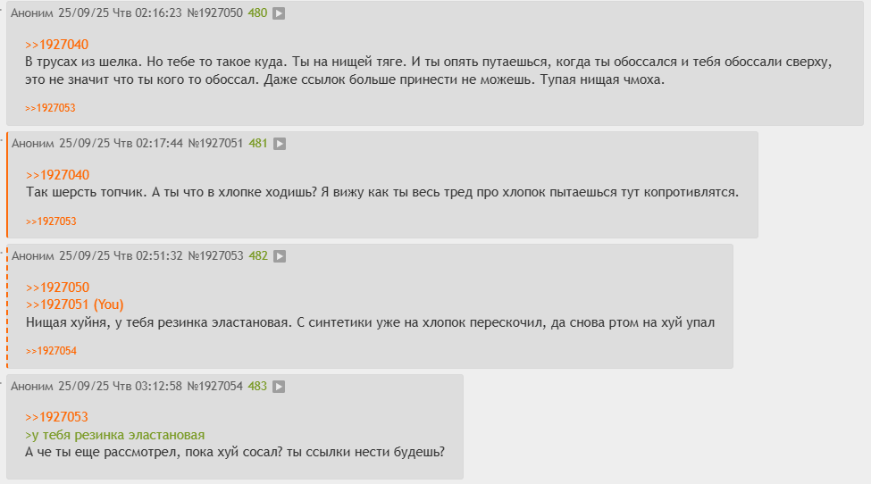 >>1927004 А кто ходит в крапивных или льняных, может ты лол, летом яйца хлопковых варишь? Ты че совсем уже попутал, шизоид?