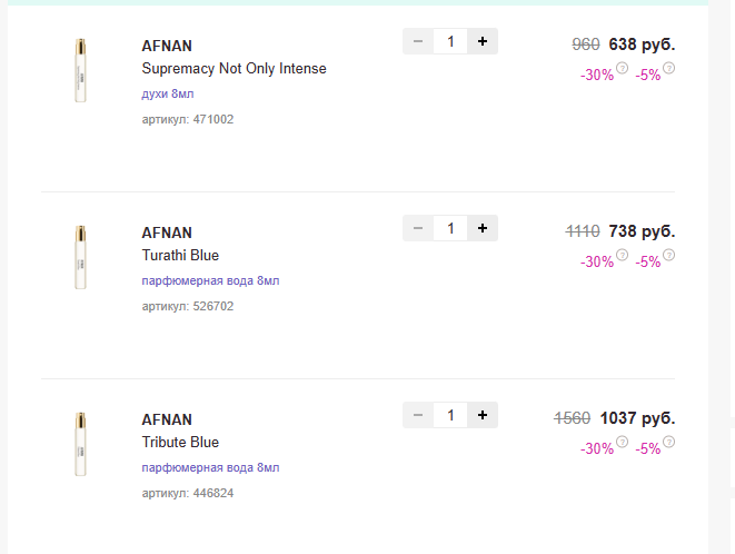Пришли три парфюма во флакончиках по 30 мл. Плюс ещё два флакона из масс-маркета лежат в коробках. Ну и отливантов по 8 мл штук 30. Надо будет вам показать свою коллекцию.