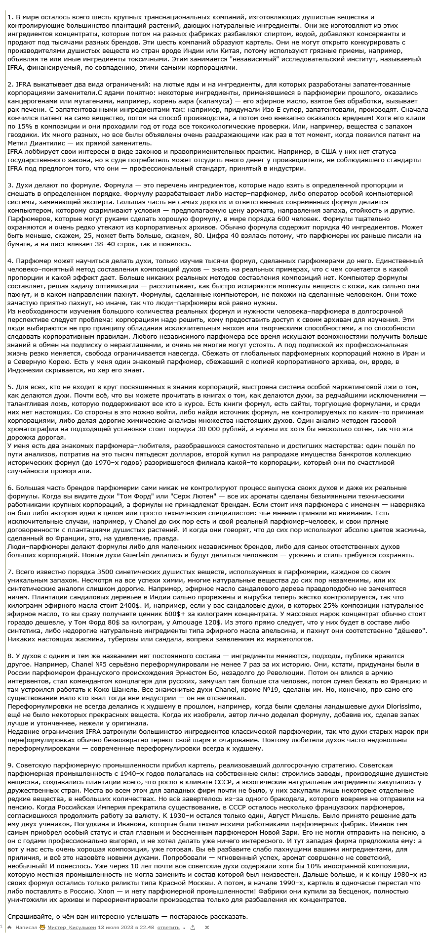 >>1924453 >единственный в мире профессор парфюмерии Кто присуждал? И интересно, почему единственный?))) >первый человек не из семьи Герлен, удостоенный звания Посла парфюмерии Guerlain А можно уточнить, что это за звание такое? За что дают? >помимо общедоступных, создает уникальные индивидуальные духи по заказу очень известных людей Ну сам он ничего не создаёт, да и никогда не создавал, в отличие от парфюмеров из Robertet, которые работают у него на аутсорсе.