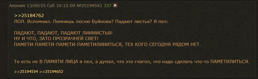 >>1923653 Приветы. Не, смутно помню. Там что-то такое кабацкое, кажется, было по стилю, да и с детства только иностращину в основном слушал - спасибо отцу, воспитавшему у меня музыкальный вкус и талант. Не там ты, мэн, осенний вайб ищешь. Послушай лучше Guns And Roses - November Rain. Или MJ - Stranger In Moscow.