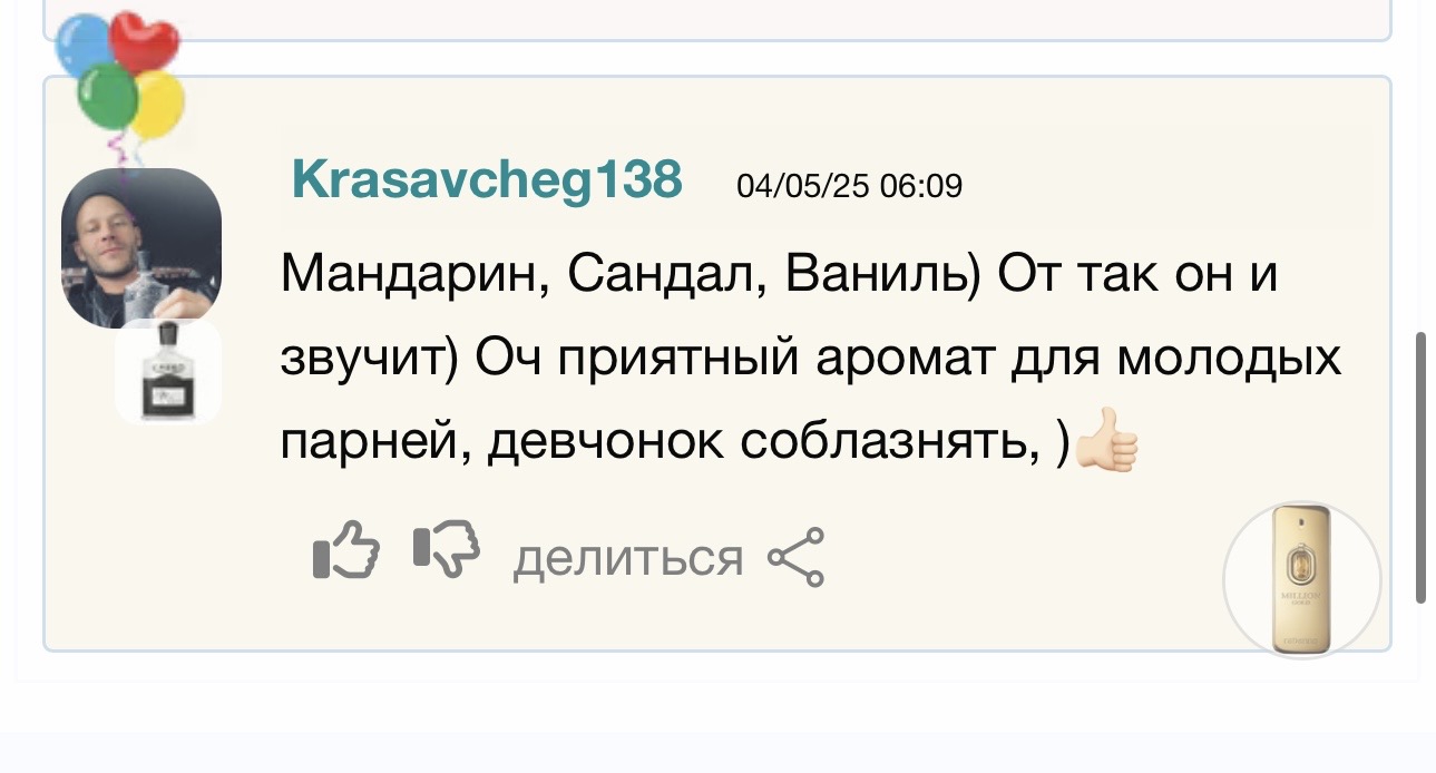 Но он громкий, два кэмпа словил за день разноса. Заполнял комнаты часа 4. Потом, на вытянутой руке ещё часов 6. Близко к коже и спустя сутки чувствовал. Описывали как, вроде обычный мужской, но заметный и сладкий приятный. И потом выбросил отливант.