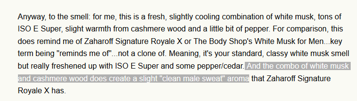 >>1928163 То что ты принимаешь за пот - легкая телесность за счёт наличие мускуса (чистого мускуса при этом отдельно вообще не слышно). Потняками ты пахнуть в любом случае не будет, слышать это тем более т.к. iso e в первые полчаса слегка прибьёт обоняние.
