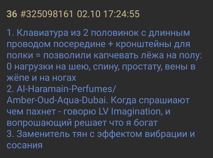 Такую вещь заметил, большее удовольствие доставляет, когда парфюм недорогой относительно и при этом это ебейший вин. Люкс в этом плане выигрывает у ниши так называемой.
