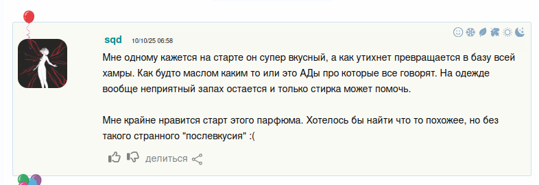 в старте почти гурманский сильнейший цитрусовый аккорд (закрыв глаза подумал бы что передо мной лежит фруктовая тарелка), в сердце что то не особо ясное с черной смородиной (которую я объективно не могу оценить из за личной неприязни), и густющая база. Окружающие сразу заметили запах, так что шлейф видимо хорош, правда они подумали что я только что из душа и от меня пахнет мыльнорыльным. Не понял почему это ставят в топ тир самых свежих. Алсо схуяли если свежак то обязательно должны быть эти цитрусы, где связь?