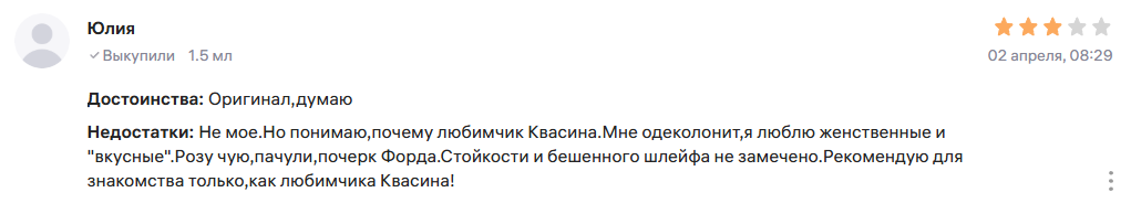 Насколько сильно TF отличается и лучше (если), чем FB? TF около 2 недель назад понюхал, очень понравился, но цена канеш дорохо. Вот прочитал, что это почти аналог его. Пришел сегодня, нанес в т.ч. и на себя, но на бумажке мне показался запах слишком простым, легко-сладким я бы даже сказал, как будто свежачок. Расстроился даже. А вот потом я распробовал аромат, а позже, когда шел по улице и чувствовал запах и то как он раскрывается, а шлейф после... Бля, я прям сижу и кайфую от запаха, он еще и стойкий или может не принюхался еще, но моему шанелю алюр хом спорту такое и не снилось. И тяночки понравилось, хотя изначально говорила слишком приторный, и матери. Но вот ТФ мне показался более маслянистым, дорогим и богатым, сам аромат более насыщенный что ли. К сожалению, его не было сегодня, сравнить не смог.
