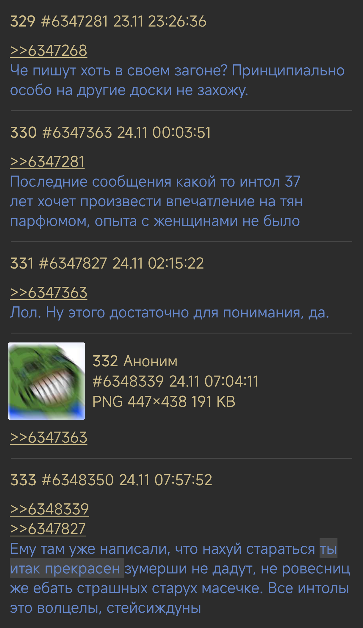 >>1943027 Я думаю что он вносит лёгкий флёр ебанцы. Если словить момент и увидеть то что он пишет, можно кринжануть. Потом обновляешь страницу и он растворился в тумане. Он как падающая звезда, нужно успевать наслаждаться моментом. Не испытываю к нему ни позитива ни негатива. Но помню он на 21 ноября обзор по 8 ароматам обещал, в итоге слово своё не держит. Единственное что в нём как-то интересно - его манера изложения мыслей.