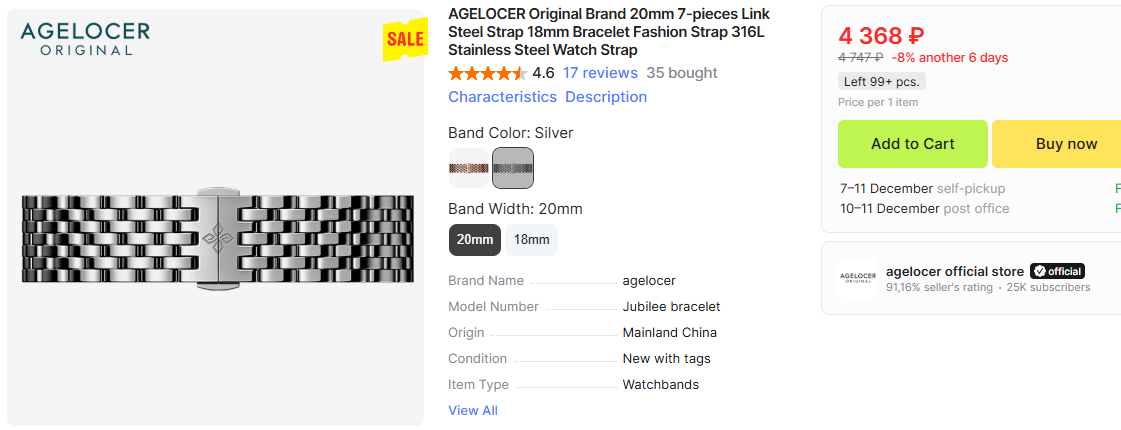 Долго выбирал китайский браслет к своей древней сертинке (заказывать оригу за 25 тысяч билетов и ждать до 4 месяцев жаба душит, так как нацелился на новые часы) и нашел только у одного продавца такое вот оригинальное плетение слегка похожее на оригинал от этой сертины, зашел к вам, а браслет какелогеровский оказался - на ширину элементов звеньев не смотрите оно варьируется в зависимости от ширины браслета и только один продавец на али с таким плетением, такой комбинацией сатина и зеркала и формой звеньев, застежка только и эндлинки понятно другие (в комплекте есть штампованные для круглых корпусов). Обработка пойдет за такие деньги, но сталь какая-то с желтоватым оттенком - фото это не передает, сталь корпуса у часов чистого серебристого цвета, штифты и шпильки говно, шпильки тонкие, оригинальные сертиновские не пролезли, пружинки в шпильках дохлые у сертиновских жесткие пружинки, штифты в съёмных звеньях тонкие и один начал выпадать - залил его синим фиксатором резьбы, такое вот какчество аселохерное. 700 рублей стоит.
