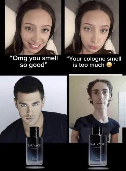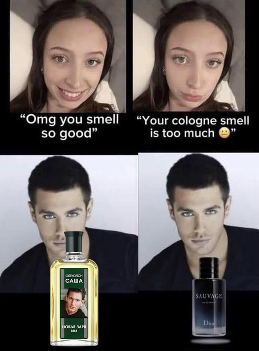 >>1951776 На самом деле чел слева нормально помылся, надел свежую одежду и пшикнулся дважды саважем. Чел справа в нестиранной одежде решил облиться им с ног до головы и вкупе с запахом пота саваж даёт вайб охранника тц