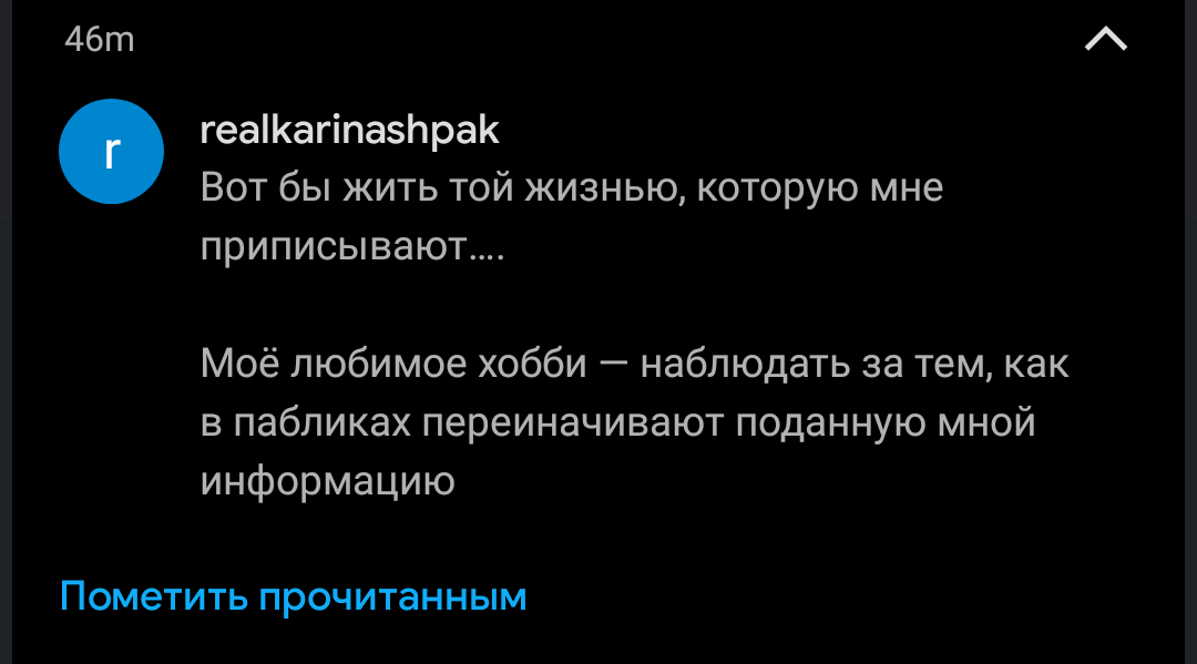 Зачем вы пишете гадости про Карину? Ладно бы она что-то плохое прямо сейчас сделала или вчера или хотя бы месяц назад. Но нет, она НИЧЕГО не делала плохого в последнее время. За что её хейтить? Как можно быть такими злопамятными?