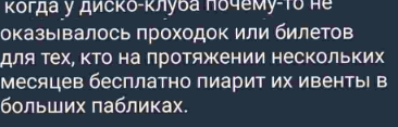 собачонка решила что в ее дежурной проссаной блузке и батиных джинсах с кислой рожей она будет в клубы после 27 ходить? подсосалась к попильной конторе, да еще и бесплатно помойки решила приглашать будут? пусть радуется что за деньги пускают, чтобы не высиралась в своем паблике от лица конторы