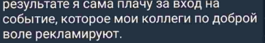>>25831472 >я вас беслпатно пиарю если бы она сама пиарила, то ладно, хотя вопрос "а тебя просили?" остается, но она там пишет, что пиарит даже не она, а ее коллеги. Или она имела в виду, что она коллегам дала задание этот клуб рекламить?