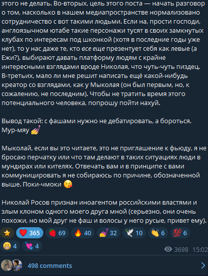 Криштарь, у меня к тебе вопрос про терпил. По фону и наушникам видно, что у них было как минимум три стрима вместе и все после слов Толи про ядерку по России. Почему ты называешь терпил людей, которые сносят ему донатилки, но не можешь высказать тоже самое Росову который активно помогал Толику уже после всех этих слов?