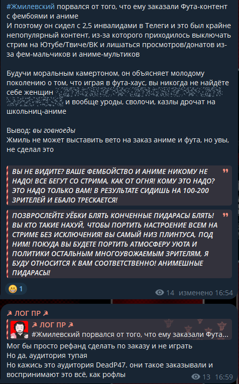 Разницу чувствуешь? Просто нести хуету на стриме, чтобы закинули донут Или напиздеть, обматерить и отхуесосить донатеров, позволить это выложить на основной канал, и какого-то хуя все должны внезапно понять (особенно залётные зрители ага), что это видите ль всё было приколом, и на самом деле Жмиль не хуесосил людей за то, что те донатят на Аниме и Фута порнуху.