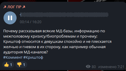 Так я вкурсе ёпт. Я тебе о чём и талдычу блять. Это тупо нужно, чтобы была обсуждаемость. Всем нравится биопроблемная тематика, без исключения. А на дваче, учитывая какие пиздюки смотрят Маргинала, это вообще работает в х3 эффективнее. Тред не тонет + есть видимость обсуждаемости + споры вокруг того насколько Маргинал инцел или нет.
