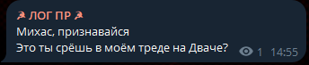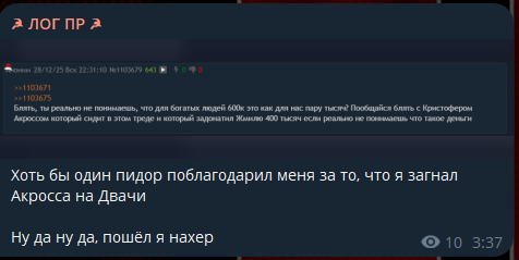 >>25983359 К чему лол? Вам даже Максин (ветеран СВО на минуточку) сказала на стриме, что я норм мужик. Так что автоматом идёте нахуй со своими угрозами. Я поболее вас готов впрягаться против всяких уродов. Вон, перечитайте мои сообщения касательно Маргинала.