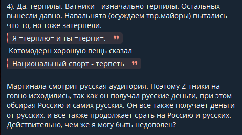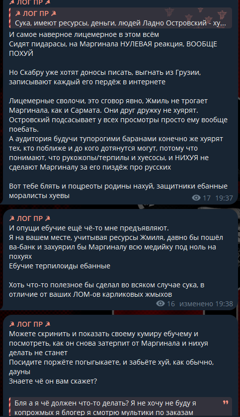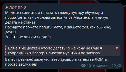 И фича в том, что Маргинал может безнаказанно годами поливать их помоями, говном, грязью, смешивать всех русским с нечистотами, и поцреотам....нормально, им заебись же. Жмилю тоже заебись, Сармату, который это всё обсуждает тоже заебись.