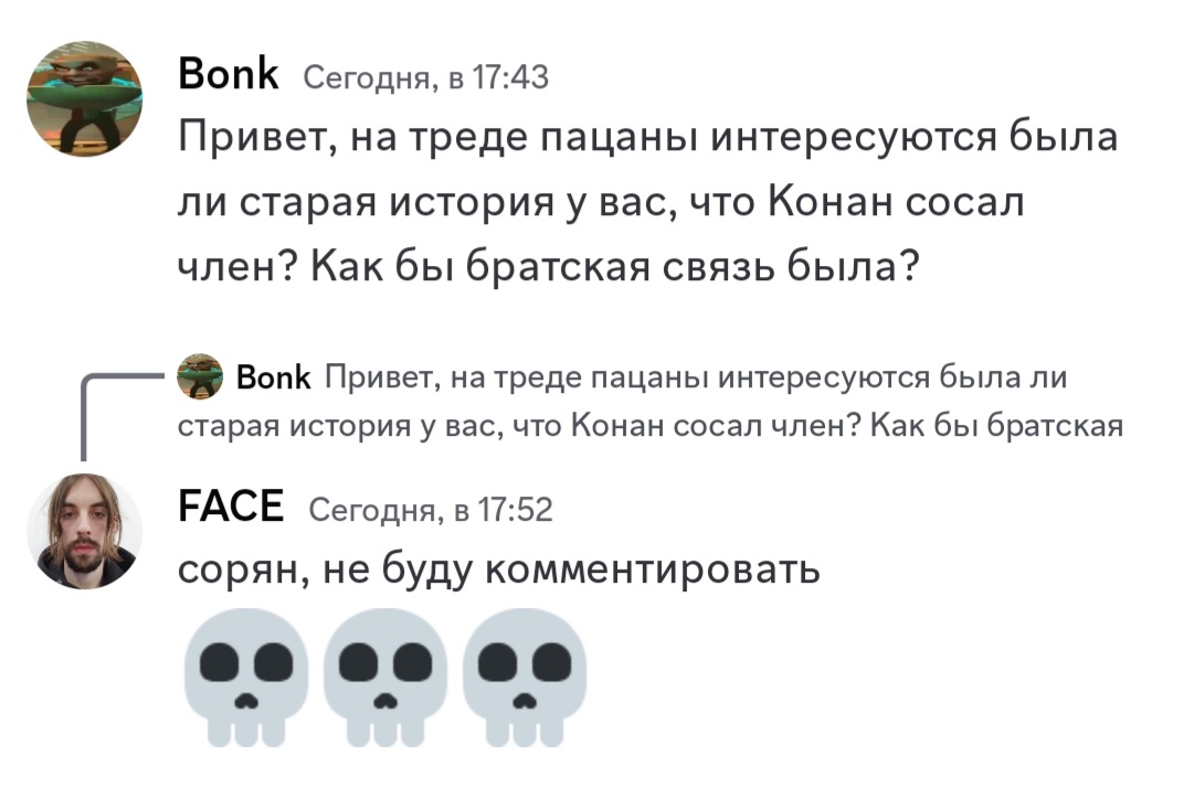 Итак, подытожим. Причина вайпа Конаном и удаления Конантреда "Обитель 93": 1. В Обители 93 анонимными исследователями был собран достаточный объём косвенных доказательств, чтобы с уверенностью заявить: КОНАН СОСАЛ СВОЕМУ БРАТУ ФЭЙСУ. 2. Тем самым подтверждались давние слухи, что отсос был, на заре карьеры Конана и по причине его девственности и "билюбопытства". 3. Получены показания непосредственного участника тех событий, Фэйса. 4. Фэйс запуган, опасается свидетельствовать напрямую т.к. Конан неоднократно наносил увечья своему брату, нарушая закон. 5. Результат расследования окончательный и пересмотру не подлежит.