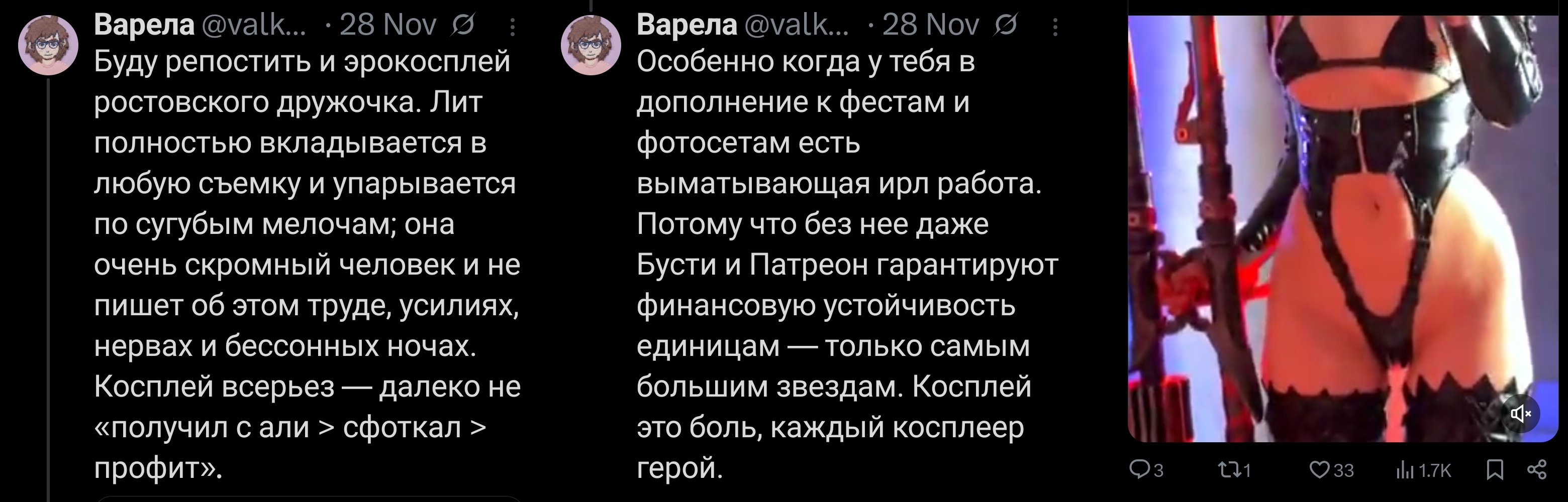 Пожалуй самая лицемерная косплеерша всего фэндома. Скромная пикми няша для славян которая стесняется записывать тиктоки и хорни развратница которая течёт в каждом втором посте для америкосов, 70К за нюдсы для нас и за 5К для них. Для Америки она 20-ти летняя Украинка которая переехала в США Простая тянка, такая же как и все, А на самом деле ей уже 30, и живёт она где-то в ЕКБ, да и она не простая а победитель кучи конкурсов и модель которую ДАЖЕ постили в журналах, Максимально старается не палиться и у неё нигде нет ссылок на US страницы, Её подписота не знает о второй личности. но менять локации её никто не научил, 2 и 3 фотки как пруф (Абсолютно одинаковая студия, больше пруфов ниже) и ещё много всего интересного ниже:
