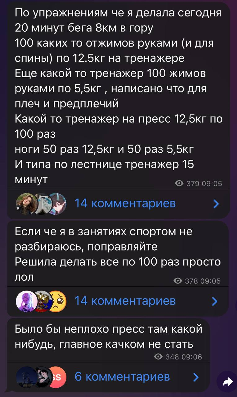 >>1772170 Да она там походу по заветам Сайтамы ебашть решила и делать все по 100. Я нихуя не понял из того что она описала, но бля, даже я будучи не в состоянии жиромясокомбината, по 100 всякой хуйни спустя большие перерывы от спорта делать не могу, спустя 50 приседаний по два захода пердак отваливается. Один хуй сольется сасайка, но понаблюдать интересно канеш