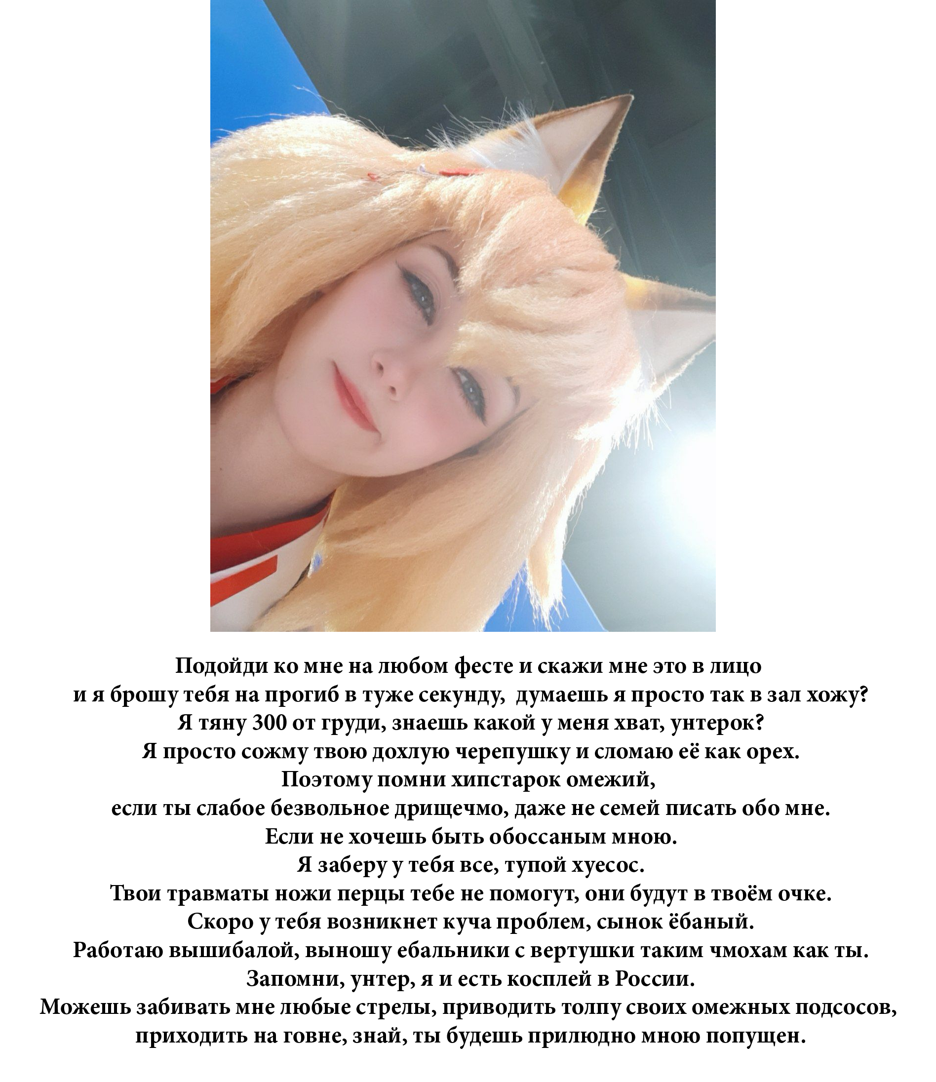 3) на стеночке ещё куча хер пойми кого. Какие-то Лисай, Никиты, хуй разберёшься. Но мне интересен вот этот кадр. Лиза/Саня/Саша. Полурак-полухуй одним словом, называют её везде по-разному. Она нахуй кто? Кучу лет в этой мастерской, косплеев в вк и инсте нет. Соцсеточки у неё полудохлые нахуй, но забавные высеры встречаются. Часто вижу это ебало в сторис богинечки. То они тусуются где-то, то на съёмках эта девка бегает на бэках, в группе мастерской она там блять и кусры и хуюрсы вела, но КТО ТЫ БЛЯТЬ АЛЛО?! ЕБАТЬ ТЕБЯ ХОЧУ! КУДА ТЕБЯ ЕБАТЬ? КУДА ТЕБЯ ЕБАТЬ? СКАЖИ ХОТЬ СЛОВО, Я ПОЙМУ КУДА!!! Это новая богинечка? Это контент, за который я хочу заплатить шекелей? Я не понимаю нахуй базаоперкуна