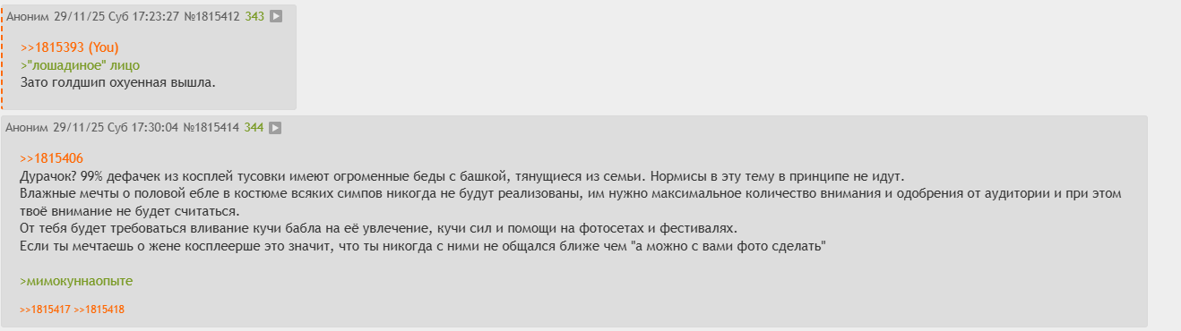 Во всех несогласных анонах ты видишь жирух-завистниц, которые просто ненавидят твою любимую лошадку, которая конечно же не такая, как эти сучки! Ведь другие не то что дают ебать писечку, они тебя просто не замечают в толпе богатых симпов. Но Оля, она совсем другая. У нее нет нюдсов, мало подсосов, она лайкает твои комментарии, а может и отвечает тебе в личке, это косплеерша твоей мечты, и даже если вы не поженитесь, то она все равно будет твоей хорошей подругой, ведь ты один из немногих, кто ценит настоящий косплей. Ну и ты наверняка понимаешь что с такой стремненькой внешностью ей не привлечь много мужиков, а тебе это не мешает, ты разглядел ее гик-душу! Поэтому ты пришел сюда, в надежде найти единомышленников, чтобы читать хвалебные посты и возвышаться в своих глазах, ведь только ты один можешь пойти и написать ей "Привет, отличный косплей" в личку, пока все остальные будут восторгаться богиней издалека...