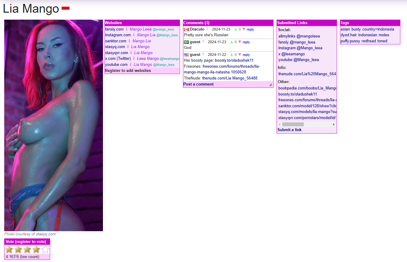 К сожалению, как и со всеми ее занятиями, кроме собственно создания костюмов и отчасти позирования в них, пар почти целиком вышел в свисток. То, что она при этом зачем-то попыталась выдать себя за индонезийскую модель Лию Манго, делу ничуть не помогло.