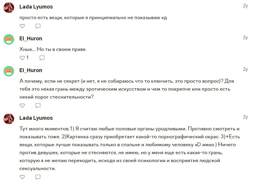 Сиськи наголо показываю, жопу крупным планом в камеру сую, а писю не не, она для любимого. Хоспаде, обожаю эти рассуждения квазишлюх о каких-то границах, хотя эти граница известны заранее. Называется ценник.