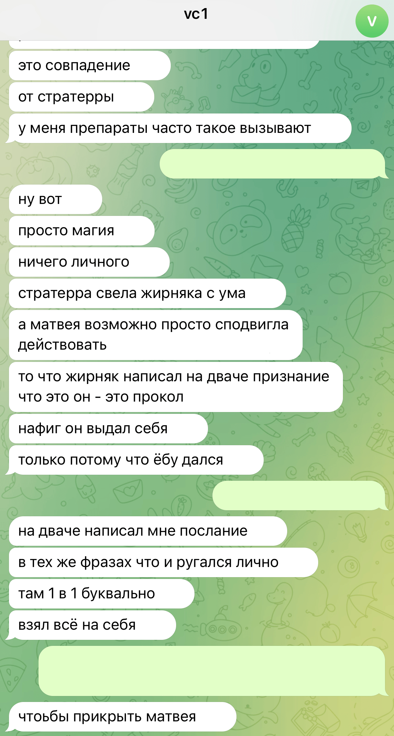 Ладно Олевия, а с Жирняком на фоне чего обострение? Сливает чаты, в итоге сломал паблик, сам с собой переписывается, стравливает персонажей, иногда отвечает за кибердаунов. Чел, ты там ок?