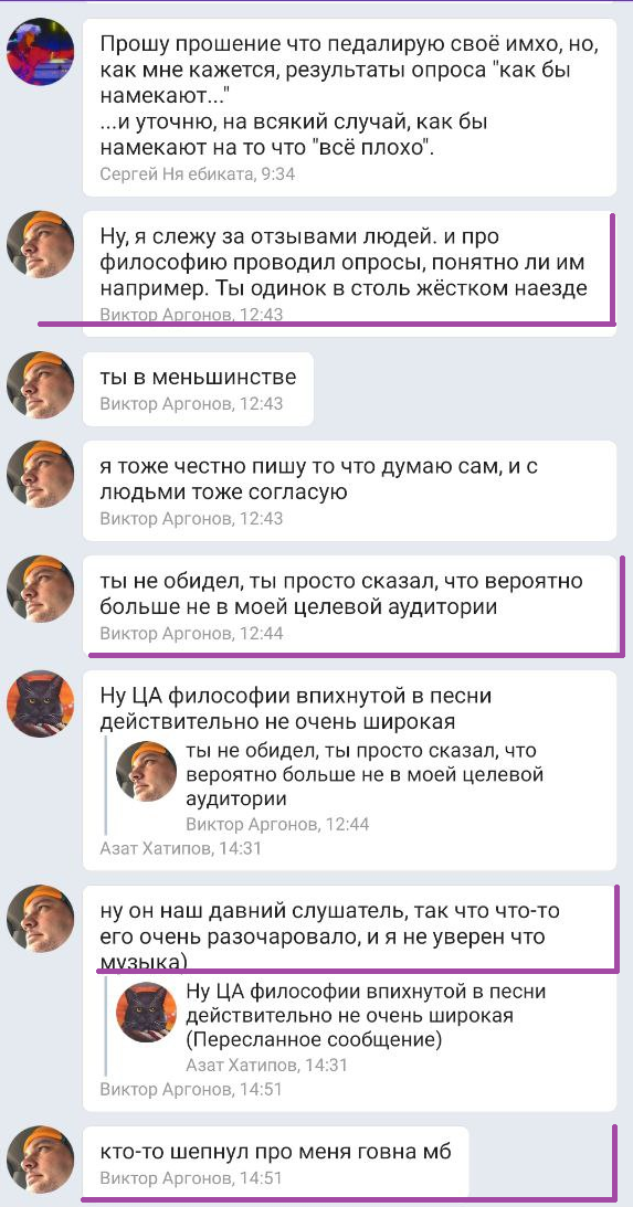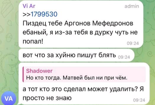 Виктор Мефедронов: Если ко мне придут менты то вы мои смертельные враги. Потому что в тюрьме я с высокой вероятностью умру, а вину разделят топовые хейтеры. Классно будет звучать - аспирант по физике Артём за то что его выгнали из чата посадил за старые переписки кандидата по физике Виктора, который умер в тюрьме. Посотрудничал с правоохранительными органами РФ против очередного неугодного музыканта