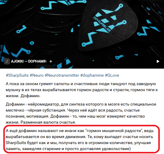 А ещё дофамин называют не иначе как "гормон мышечной радости", ведь вырабатывается он во время движения. Те, кому выпадет счастье носить SharpSuits будет как и мы, получать его в огромном количестве, улучшая память, замедляя старение и просто доставляя удовольствие)