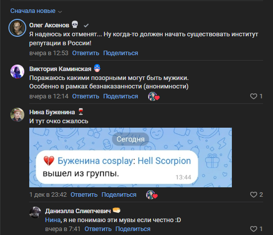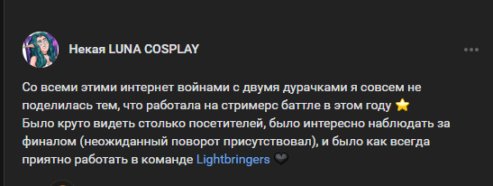 Интересное развитие событий. Я думал что всё заглохло - а тут по ходу, пошла культура отмены. Коротко. Сабж выпустила два видоса про эту ситуацию. Мне процарапало глаза, что там скрины подерганы из треда в определенном контексте - и что просто сводят свои счеты через двач. А тут вот оно как - пришли другие косплееры, начался бугурт.