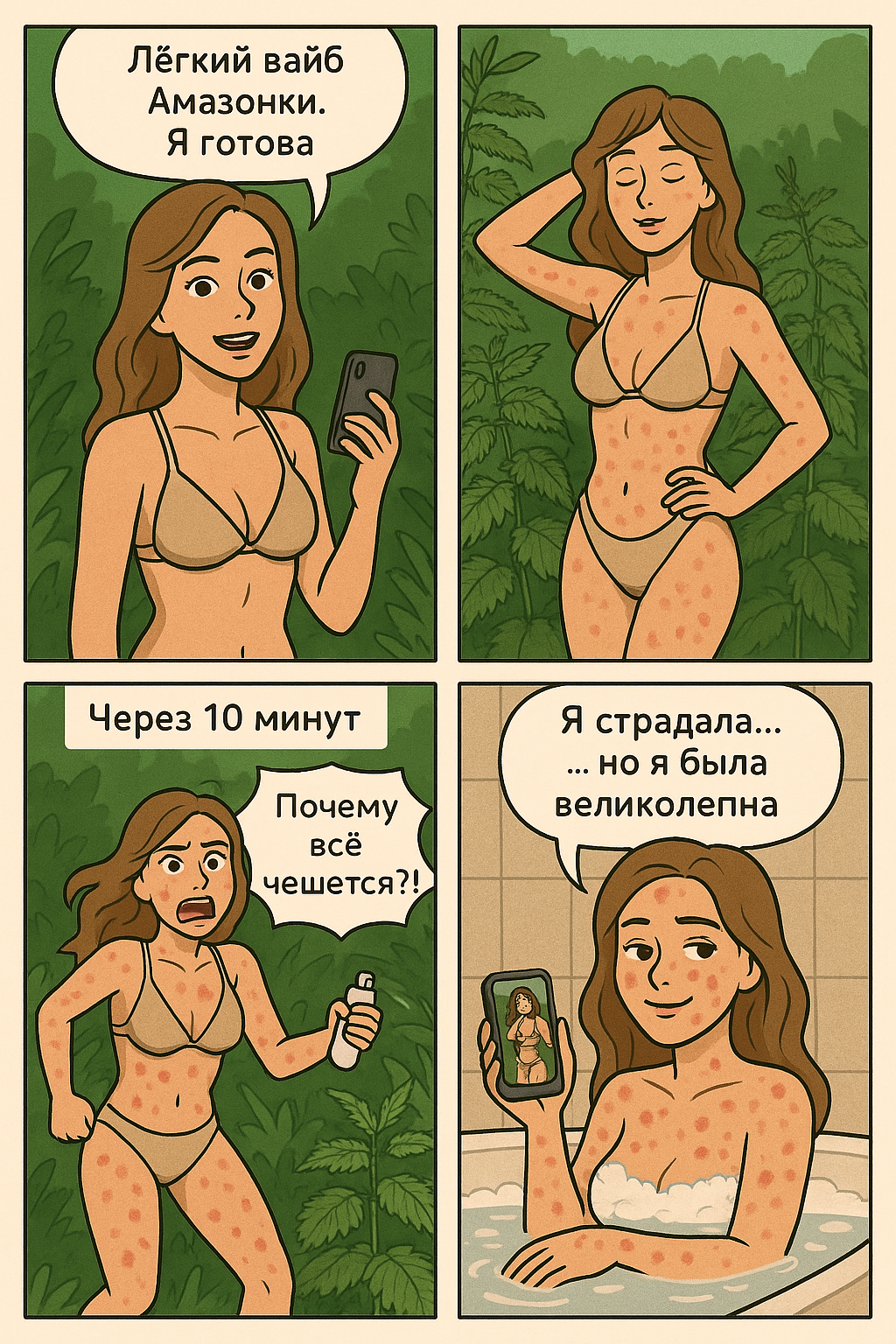 Юля открыла дверь… - Юля, привет! – сказала я, перешагнув порог - Привет, Катюха! – ответила она Я прошла к Юльке на кухню. Дома была только она. - Присаживайся! – сказала Юля – Я чай пью, угощайся! – и Юля присела на табурет. Я же не стала садиться за стол, я, дождавшись, когда Юлька сядет, стоя перед ней, нагнулась, и рывком через голову сняла своё платье, оставшись в бикини, после чего, кинув платье на свободный табурет, поставила руки на пояс, выставив напоказ Юльке своё изжаленное крапивой тело, полностью покрытое красной сыпью… - Ну, как? – улыбаясь, спросила я - Обалдеть! – сказала, окинув меня взглядом, Юлька, а потом добавила – Это после крапивы так? - Ага! – ответила я - Офигеть! А они у тебя не болят? - Вчера – весь вечер и потом всю ночь тело аж горело, жгло и при каждом движении больно показывало… А сегодня – вот это, но не болит, только немного чешется… - Ну, зато теперь ты знаешь, что бывает, если залезть в купальнике в крапиву! – улыбнулась Юлька - Ага! – довольно сказала я – Знаю… А знаешь, Юль! Я опять туда хочу! - Куда? – удивлённо кинула на меня взгляд Юля - В купальнике залезть в крапиву! - Да ты что, у тебя же всё тело в краснющей сыпи! - Да! А я всё равно хочу! – широко улыбаясь, говорила я - Ну, хочешь – иди! – улыбнулась в ответ Юлька - Пошли вместе! – сказала я - Ага, щас! – ответила Юлька - Ну, я тебя раздеваться и лезть со мной в крапиву в купальнике не заставляю, но ты меня там поснимаешь, как я буду там, в крапиве, купаться! - Ну, ладно! Пойдём! – согласилась Юлька – На такое шоу, как ты купаешься в крапиве, я всегда рада посмотреть! - Ура! Идём! – с горящими от восторга глазами сказала я, а потом добавила – Только ты со мной в крапиву всё-таки зайди, чтобы в этот раз прям видно было, как я там хожу! - Зайду-зайду, Кать, не беспокойся. Но хорошо, что ты мне сейчас это сказала, возьму с собой свитер, чтобы руки твоей крапивой не обжечь. Юлька взяла свитер, и мы пошли в коридор. - Ну, открывай! – сказала я - Так, Катюх, ты платье не забыла? – улыбнулась Юля - Нет, не забыла! – улыбаясь, отвечаю я - Ты что, прямо в купальнике собралась идти? - Ага! Ты заценила, какое у меня тело после крапивы? Как оно всё покрыто красной сыпью?! Вот, пусть другие тоже посмотрят, что я с собой сделала!