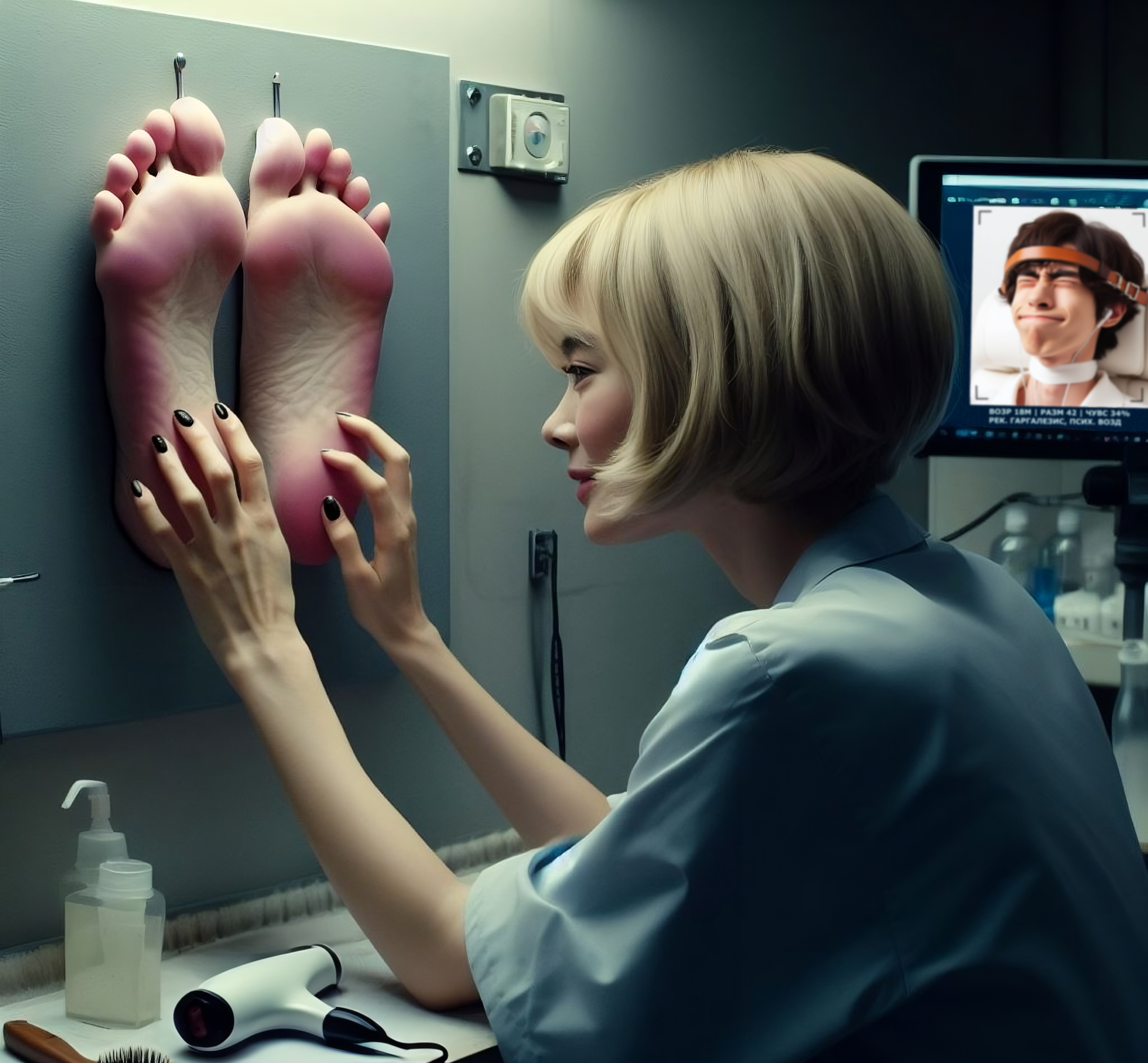 1. Размещение в экспериментальной камере: · Пациентка заходит в помещение с контролируемой температурой (22-24°C) и влажностью (40-60%). · Она ложится на платформу с «эффектом памяти», которая плавно подстраивается под контуры ее тела, обеспечивая нейтральное и комфортное стартовое положение. 2. Иммобилизация: · Между верхней частью тела и ногами устанавливается непрозрачная перегородка, чтобы исключить визуальный контроль и возможность произвольного сопротивления. · Система ожидает сигналов о расслаблении Пациентки (датчики мышечного тонуса, стабилизация дыхания и ЧСС). · После достижения состояния покоя, мягкие, но прочные ремешки фиксируют лодыжки и бедра, предотвращая крупные движения, но не вызывая дискомфорта или нарушения кровообращения. 3. Базовое 3D-сканирование стоп: · Этап 1 (Бесконтактный): Роботизированный манипулятор с лазерным 3D-сканером совершает облет стоп, создавая высокоточную цифровую модель их геометрии и рельефа. · Этап 2 (Тактильный): Другой сканер, оснащенный сенсорной матрицей, аккуратно прислоняется к различным участкам стоп для калибровки тактильной чувствительности и построения карты давления. · На основе объединенной модели система искусственного интеллекта определяет оптимальные точки для подключения электродов и зоны для последующей стимуляции, составляя «Карту рефлексогенной чувствительности».