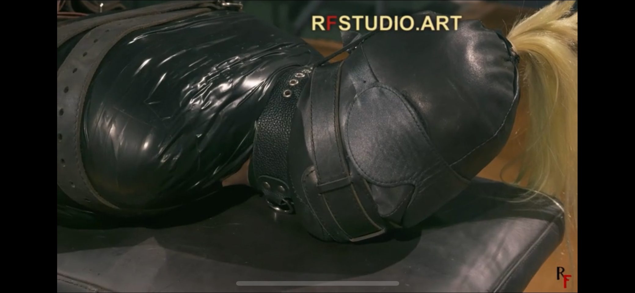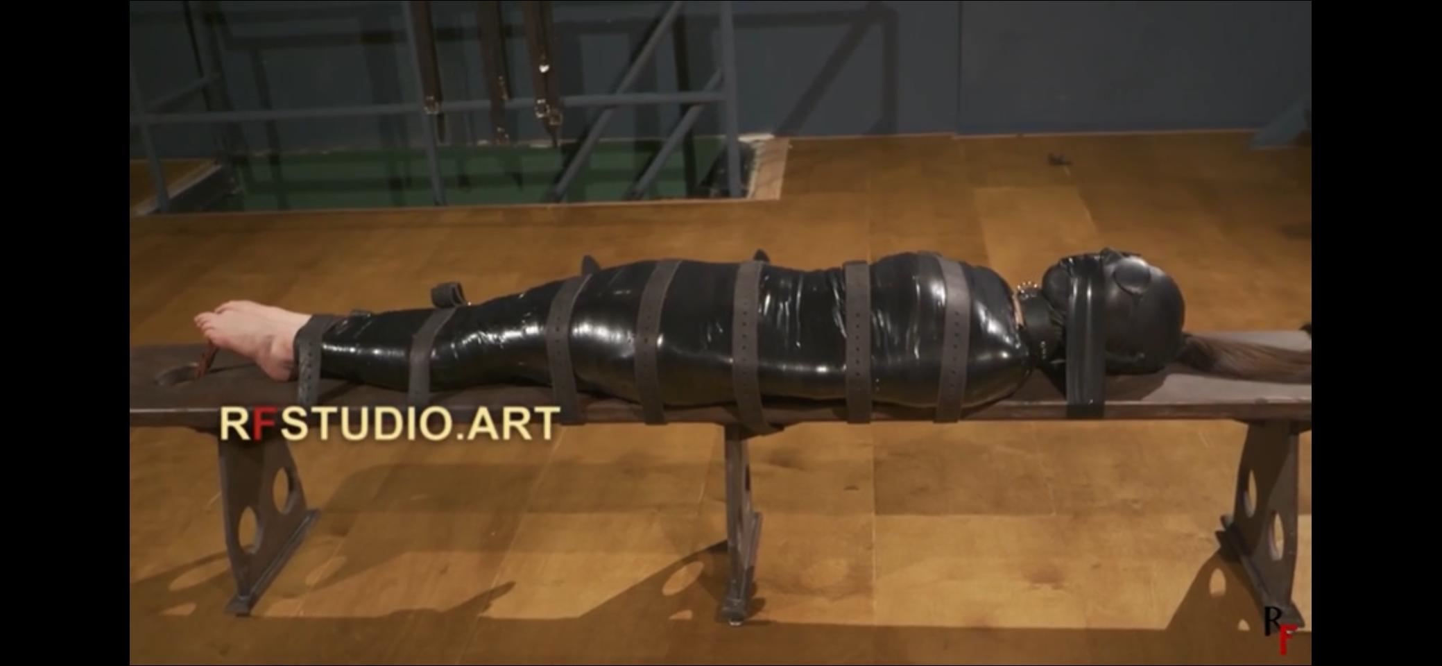 В этом первом ролике Секретная модель полностью мумифицирована и прикреплена к верстаку. Единственные открытые части ее тела - это босые ступни, от которых исходил легкий, естественный аромат, который я помню до сих пор. На ней капюшон из сенсорной кожи и сумка-мяч, она лежит в ожидании того, что произойдет дальше, полностью погруженная в происходящее.