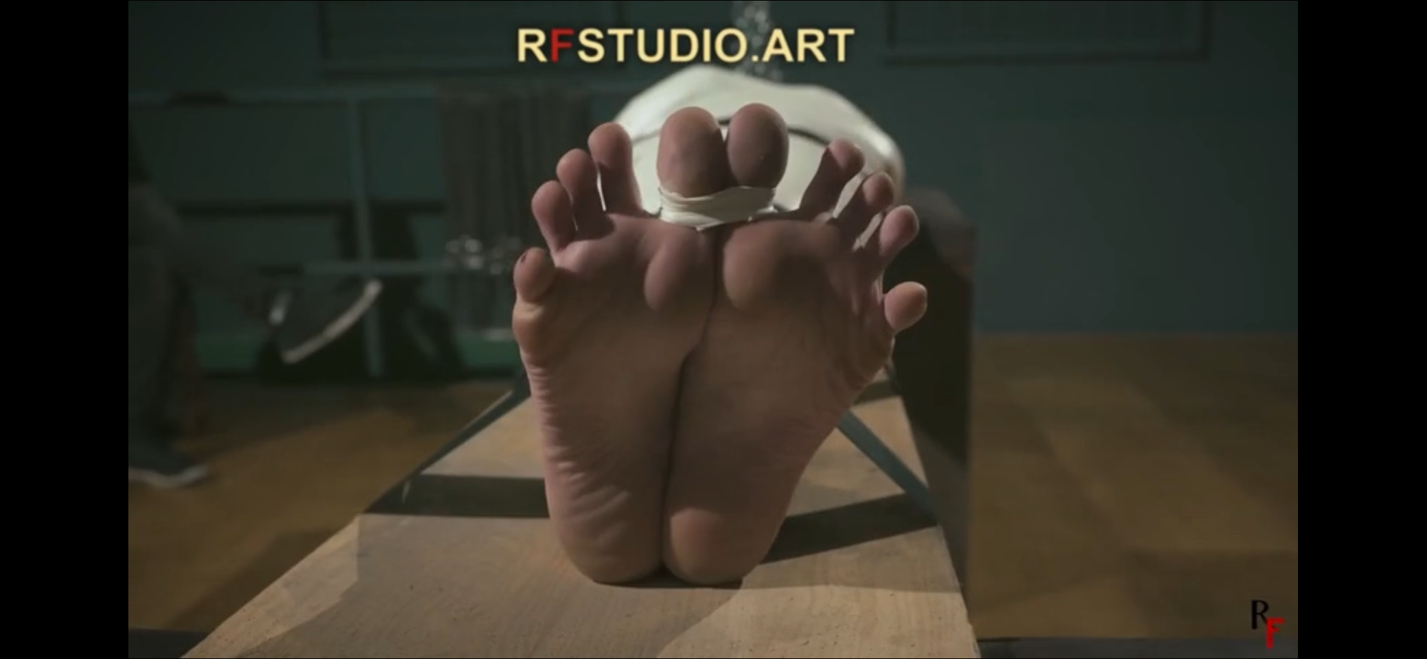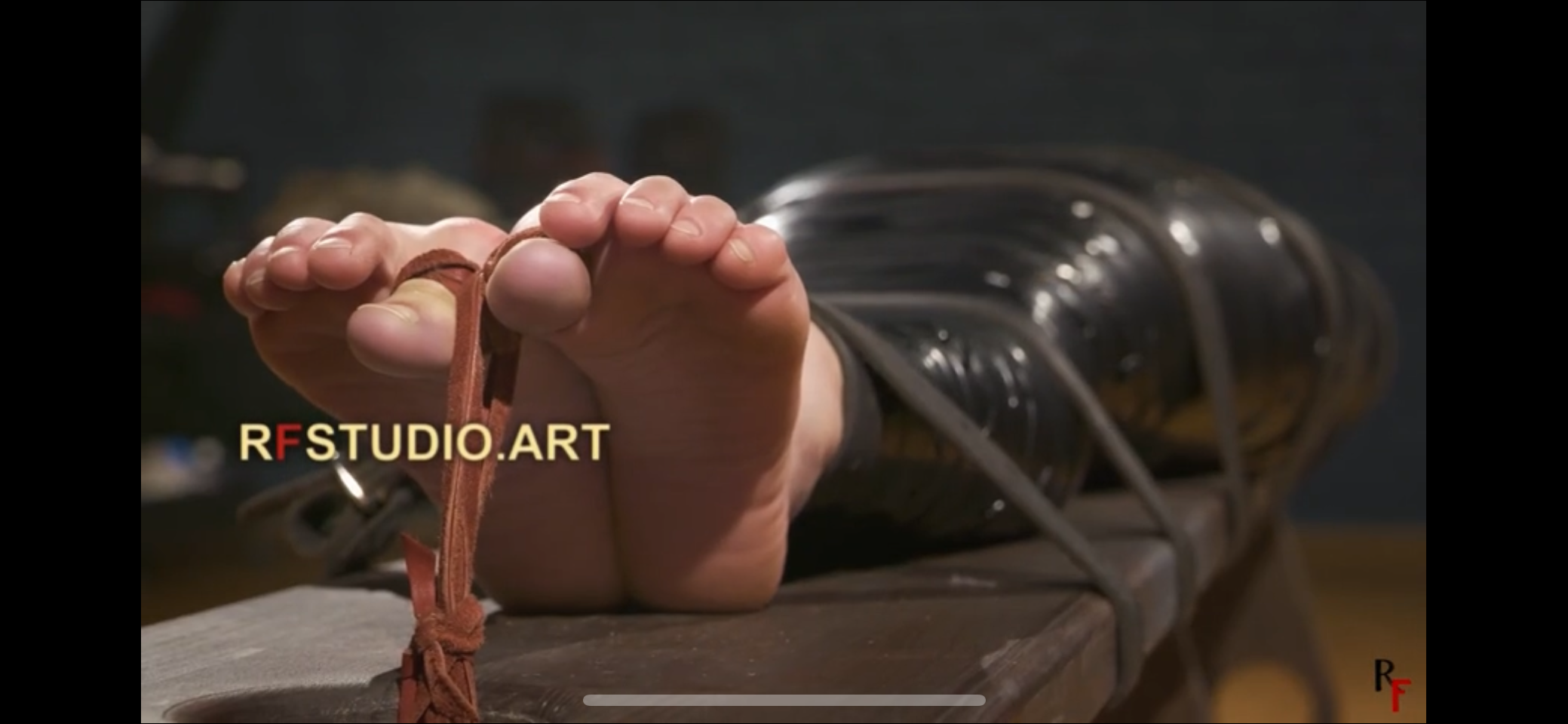 В этой части Секретная модель остается полностью пристегнутой к скамейке в полной мумификации, обнажены только ее босые ступни. Ее лодыжки закованы в колодки, а сексуальные пальчики ног связаны. Теперь пришло время для "бастинадо".