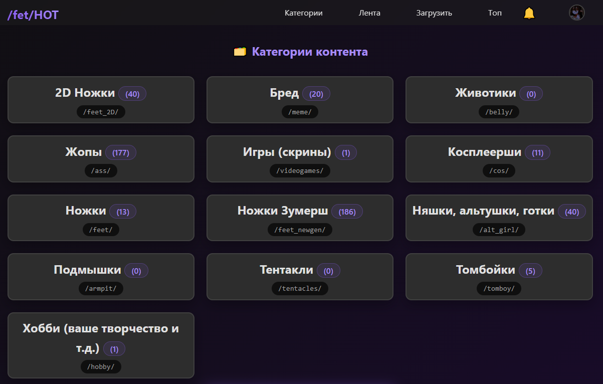 Функциональчик для вас: 1) поиск по тегам 2) публикация (с указанием тегов и категории) 3) имеется просмотрщик фоток (с возможностью скачать) 4) категории на главной странице 5) лайки, дизлайки и комментарии 6) отправка жалоб (вдруг чето не так) 7) сортировка постов (по дате и лайкам) 8) система аккаунтов, со списком ваших лайков и стеной как в старом вк хввххвпхпх (можно и анонимно выкладывать) 9) избранные 10) рейтинг у аккаунтов (лайки-дизлайки за все посты = рейтинг) 11) уведомление для вашего аккаунта 12) можно подписываться на пользователей, чтобы в ленте были только их посты Есть такие категории на данный момент, но можно предложить новые: 2D Ножки, Бред, Животики, Жопы, Игры (скрины), Косплеерши, Ножки, Ножки Зумерш, Няшки, альтушки, готки, Подмышки, Тентакли, Томбойки, Хобби (ваше творчество и т. д.)