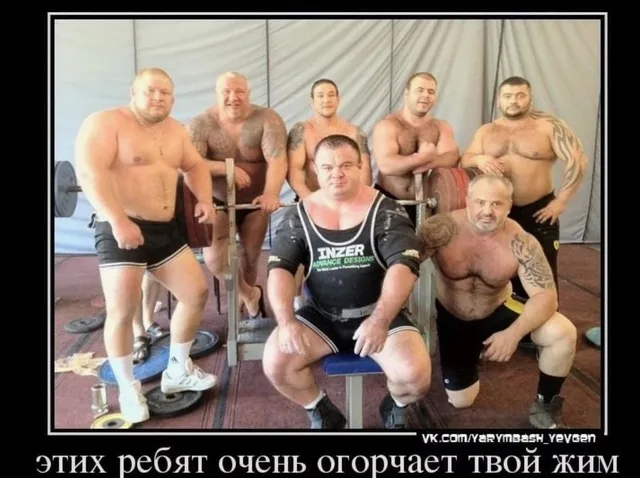 Жим в майке, еще и с мостом, это же чистые понты. Всегда угарал с такого "спорта". Еще и нахолбучаться всякими стеройдными тестостераноми. Присед в комбезе и становая в стиле сумо. Ну это чисто читерские техники, направленные на то чтобы вызвать у публики эффект "вау". Но всем уже давно похуй. А поднимать свое ЧСВ, таким способом, имхо глупо и не тру. Просто будь собой, обкачивайся доступными весами, не гонись за ними и не надрывайся. Ведь главное в спорте, это чтобы у тебя нормально работал желудочно-кишечный тракт, т.е. чтобы не было запоров, в этом вся суть движения.