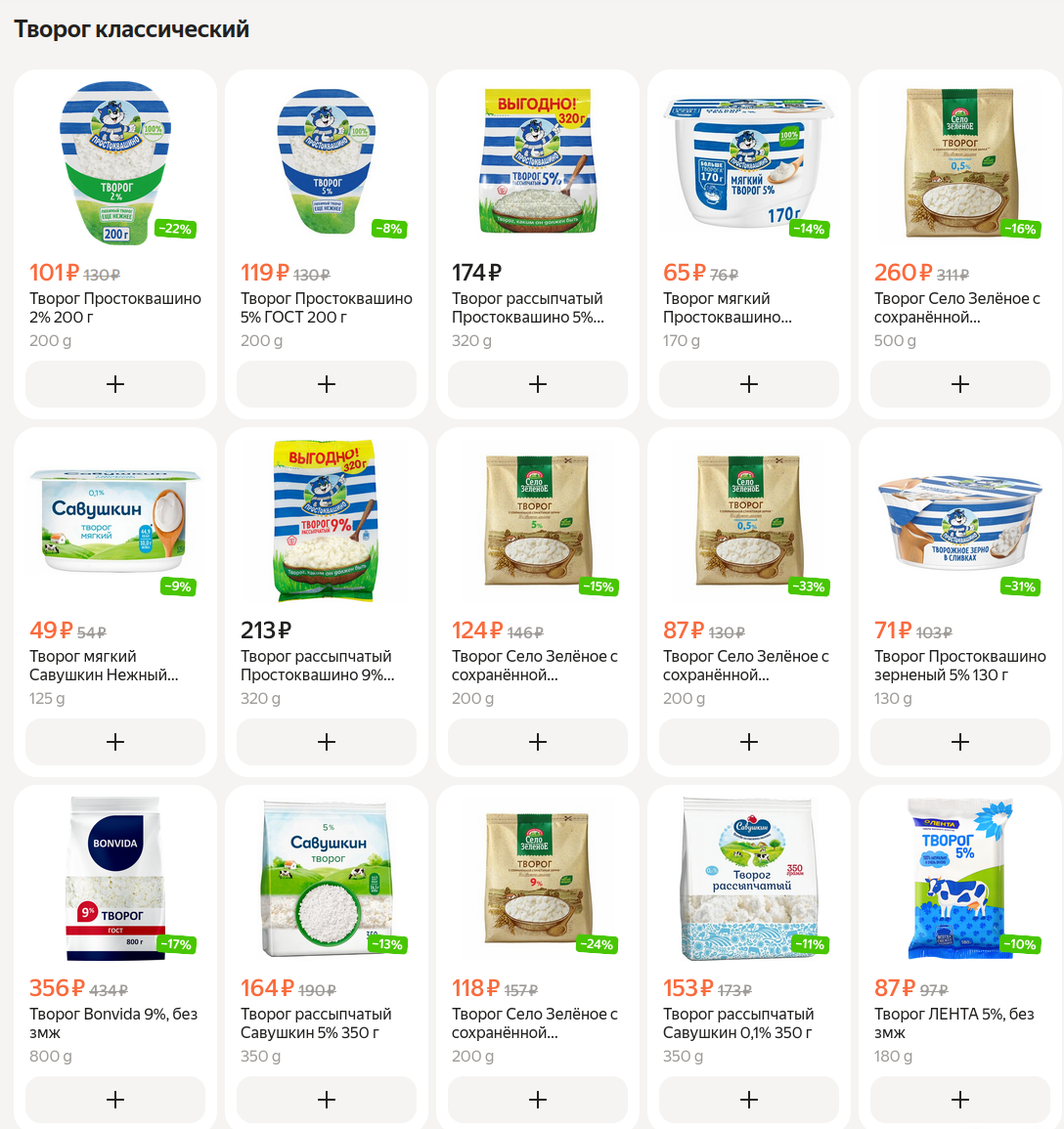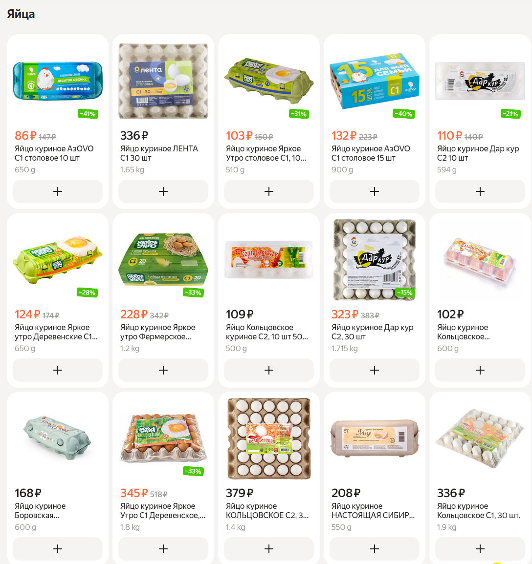 >>2633198 У меня в супермаркете самые дешевые яйца стоят 65р и они все в кале и часть битые. Творог 200-220р за 500г. Куриное филе от местных производителей самое дешевое 406 рублей за 1кг, но оно резиновое по вкусу. Овсянка 70р за 800г, гречка 87-90р за 800г. Сметана 107р за 400г, кефир 90-124р за 950мл