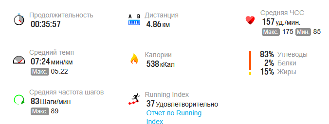 Часы определяли темп и дистанцию с выключенным GPS, поэтому точность ниже. Если для бега ещё темп более-менее точный (но всё равно на 30-40 секунд выше, чем обычно для таких интервалов), то для ходьбы между интервалами часы безбожно врут - показывают темп ходьбы раза в 2 больше, чем обычно. Возможно, из-за того, что данных по бегу намного больше, чем данных по ходьбе.