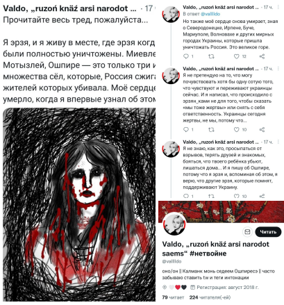 >>501873 Это творчество А. Болькина (Боляеня Сыреся), поехавшего военного пенсионера из Киева (родился в Саранске, отец эрзя, мать русская). В 1992 году он попал под влияние известного укронацика Черновола, который в советское время сидел на зонах в Мордовии и знал об эрзянах гораздо больше, чем сам Болькин. После 2014 он радикализовался до того, что поехал добровольцем в АТО и вступил вот в эту организацию: https://en.wikipedia.org/wiki/Free_Idel-Ural