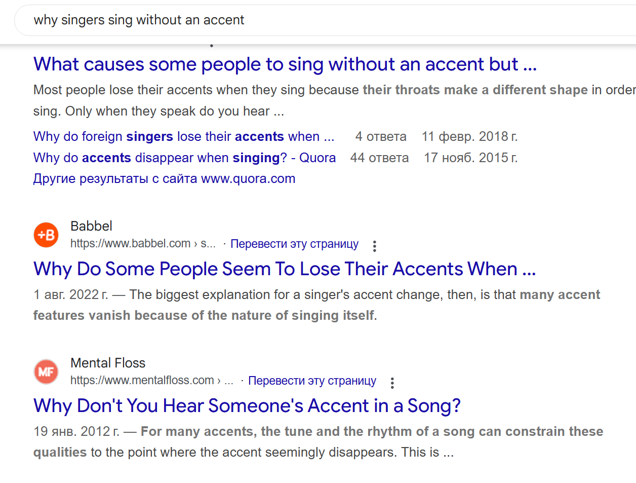 >>729428 Акцент пропадает при пении потому, что ты когда поешь ты скорее издаешь звуки, похожие на слова, а не произносишь слова, поэтому манера именно говорения может пропасть, и ирландец запоет королевским, условно. Тенденция такова, если не эксплуатируется именно звучание акцента, как в рэпчике.